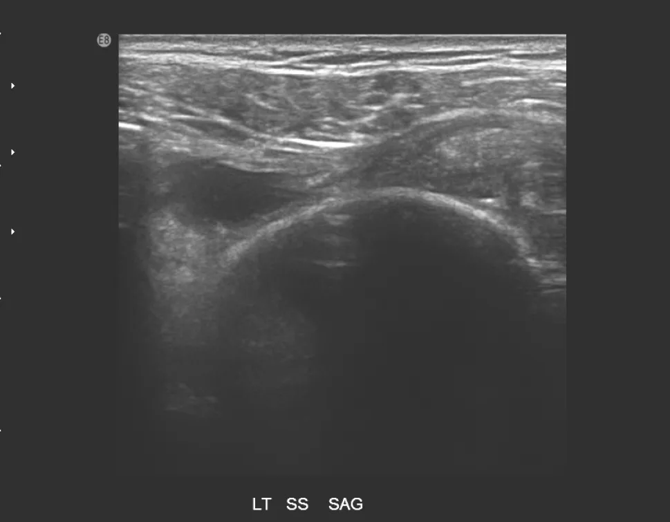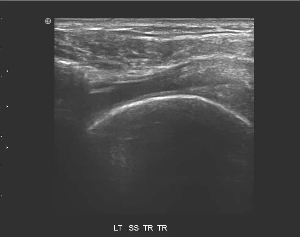 【106-1 醫學(六) 第72題】85歲女性患者,主訴左肩疼痛超過6個月,有局部壓痛,無肌肉萎縮現象,圖為左肩部超音波檢查,上圖為旋轉環帶長軸切 面,下圖為短軸切面,最可能之診斷為何?