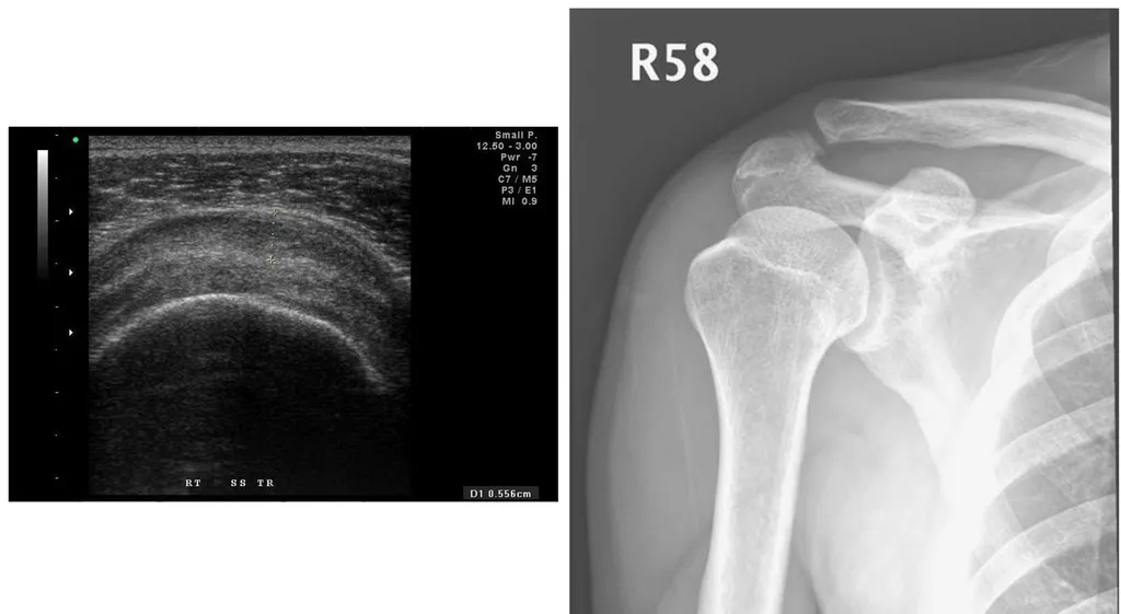 【106-1 醫學(六) 第73題】51歲男性病人,右側肩膀疼痛,且轉動受限。超音波及X光片檢查如圖,最可能的診斷為何?