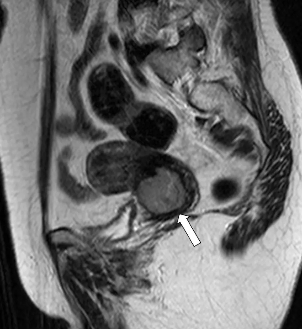 【106-2 醫學(六) 第74題】59歲女性,下腹部磁振造影檢查(T2WI)如圖,有關箭號所指之處,何者敘述最正確?