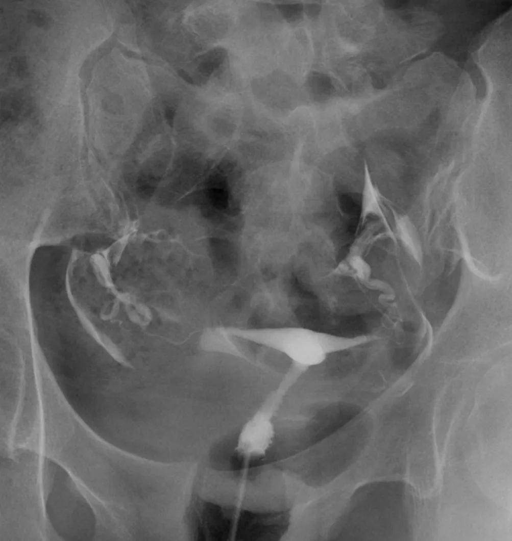 【106-2 醫學(六) 第75題】不孕症女性,子宮輸卵管攝影檢查呈現如圖,下列敘述何者最正確?