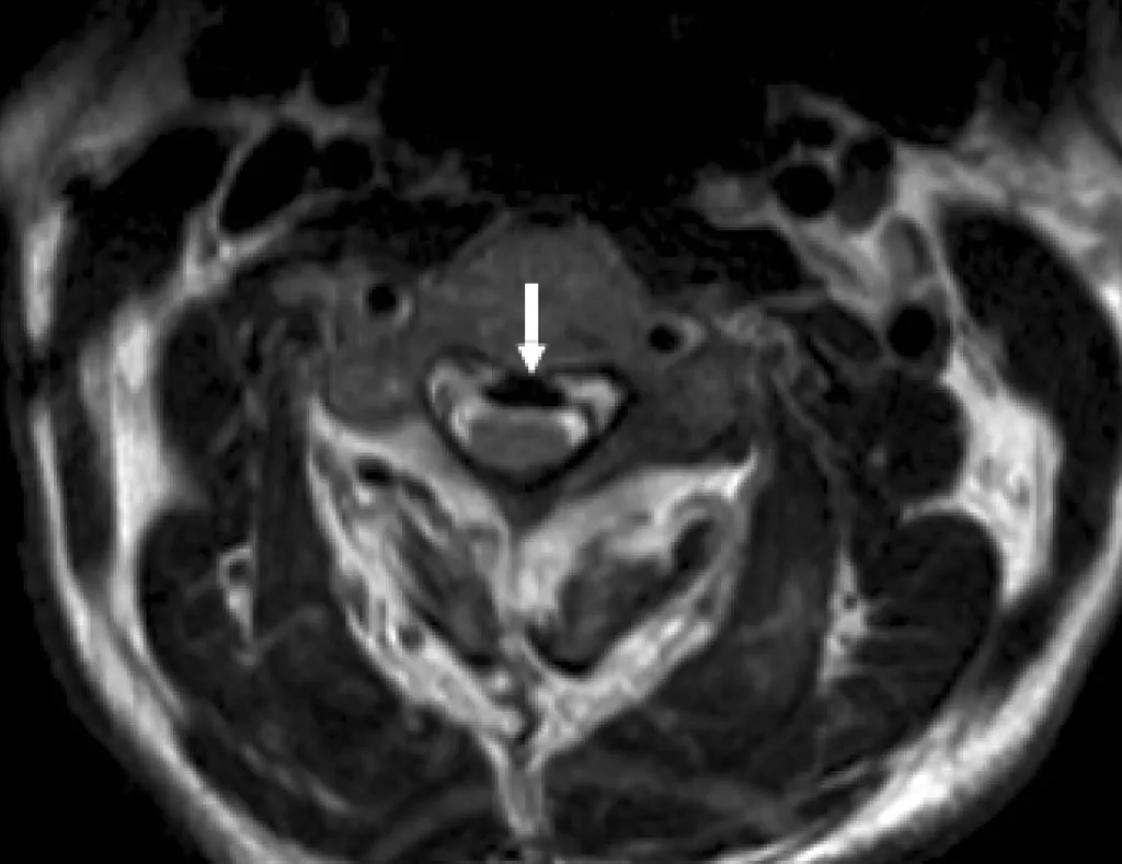 【107-1 醫學(六) 第72題】71歲男性不慎跌倒之後,頸部異常疼痛,合併有上肢酸麻感覺;磁振掃描橫向T2加權影像如附圖。其最可能的診斷為何?