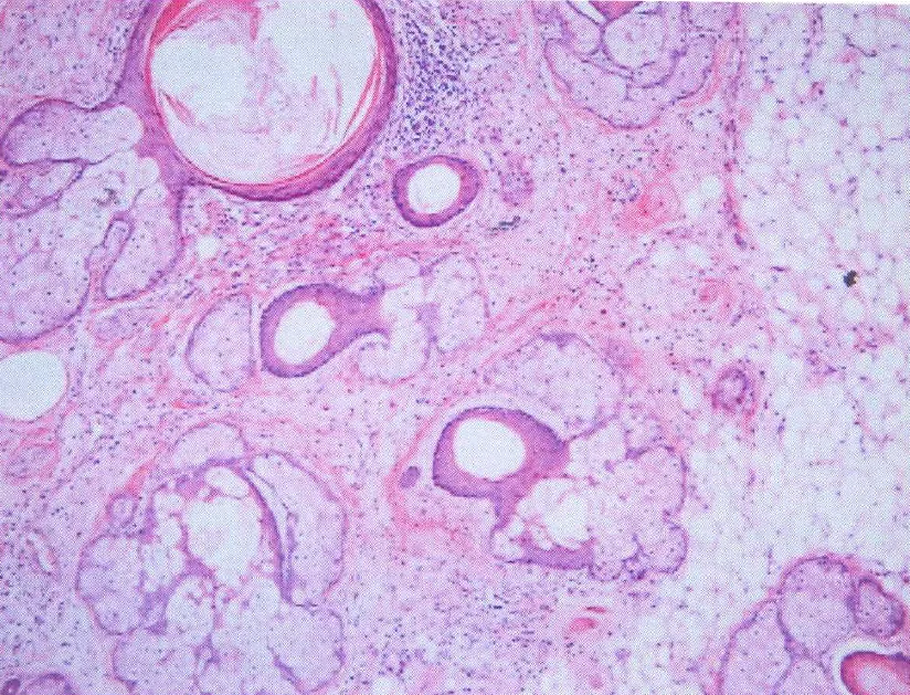 【107-1 醫學(二) 第94題】附圖顯示一位40歲病人的睪丸腫瘤之局部,下列有關敘述,何者最不適當?