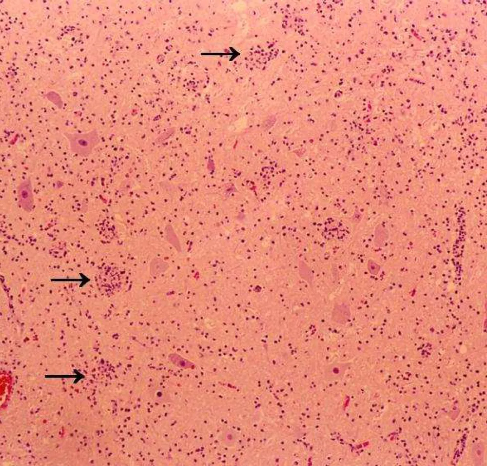 【107-1 醫學(二) 第79題】下列三類病毒,何者可在神經系統造成如圖箭頭所指的病變? ①水痘-帶狀疱疹病毒(Varicella-zoster virus) ②腸病毒(Enterovirus genus) ③西尼羅河病毒(West Nile virus)