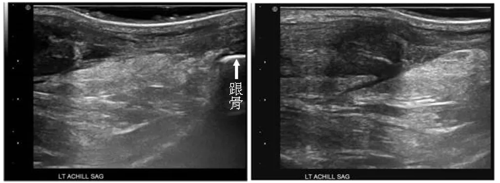 57歲女士主訴下樓梯時,突然左腳後跟劇烈疼痛,隔天至骨科門診,接受腳後跟超音波檢查矢狀切面如圖, 最可能之診斷為何?