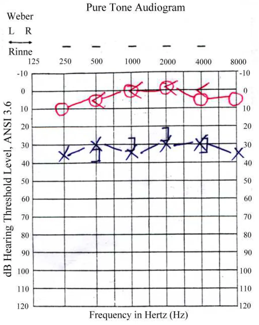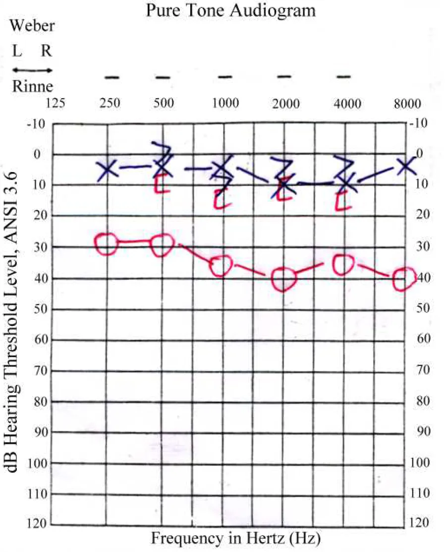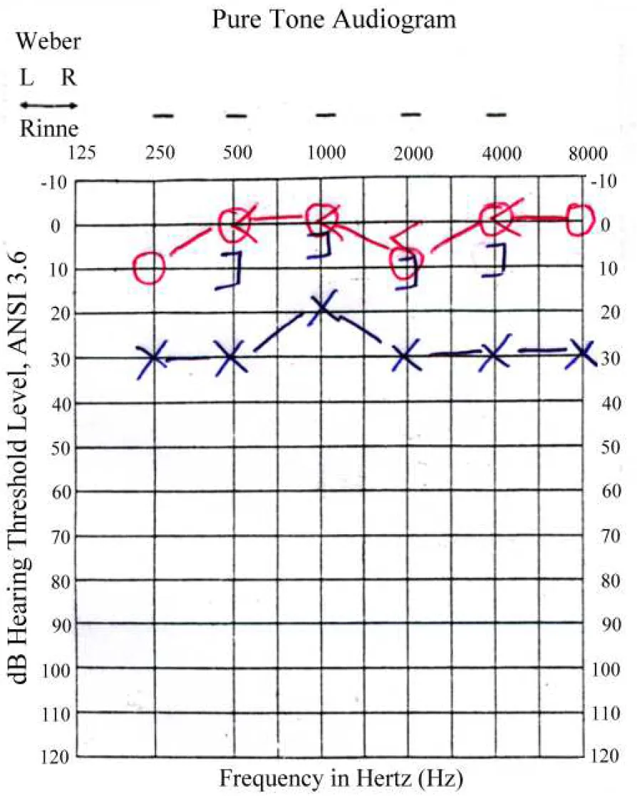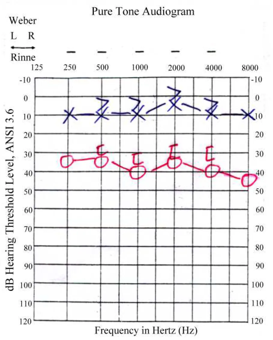 【107-2 醫學(六) 第22題】承上題,此病人接受純音聽力檢查(pure tone audiometry),最可能的結果為下列何者?