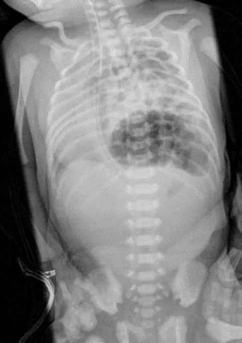 【108-1 醫學(四) 第9題】新生兒出生後即有呼吸窘迫、唇色發紫、胸部較腹部來得高突的現象。身體診察發現最大心音在右側。胸腹部X光片如附圖,最有可能的診斷為何?