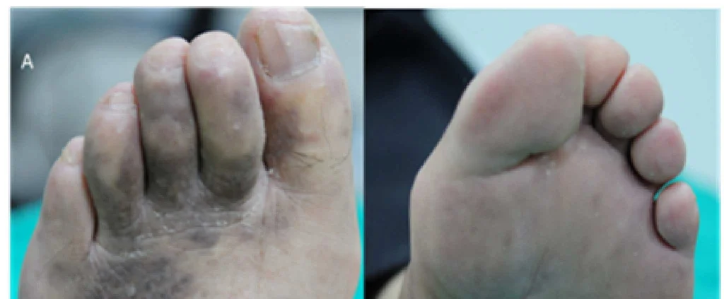 75歲男性,2年來逐漸在足部出現紫色斑塊(如圖A),皮膚病理檢查發現有篩板狀血管的增生(如圖B),最可能的診斷為何?