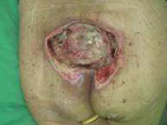 【108-2 醫學(五) 第49題】70歲老先生因中風長期臥床,在他的薦骨部有一面積10×8公分深可見骨的褥瘡(pressure sore)(如下圖),造成褥瘡的最主要原因是: