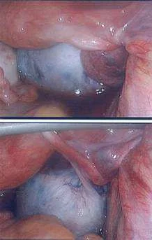 23歲女性於近兩個月常感覺右下腹疼痛,此疼痛有時改變姿勢可改善症狀,今日則因疼痛加劇且合併有噁心嘔吐之情形就醫。理學檢查發現右下腹有壓痛及反彈痛之情形,經陰道指診發現子宮大小正常,但有觸壓疼痛的情形,同時子宮右邊有腫塊如鵝蛋大小,亦有觸壓疼痛的情形。超音波掃描發現右邊子宮附屬物有腫塊,大小約7×8公分。由於右下腹痛加劇,因此接受腹腔鏡檢查,腹腔鏡檢查發現有下圖之情形,依據圖示此患者最適合之診斷為: