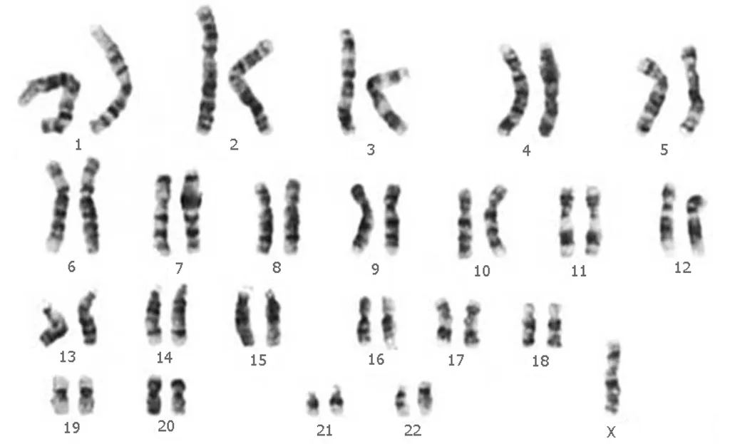 【108-2 醫學(六) 第55題】15歲就讀國三的女生因為至今仍無初經,由媽媽陪同前來看診。她身高140公分,體重35公斤。理學檢查發現無第二性徵,有明顯的蹼狀頸(webbed neck)。媽媽回憶女兒小時候因為先天性心臟病有接受過手術,也帶來過去做的染色體檢查報告,如圖所示。關於這名患者的狀況,下列敘述何者正確?