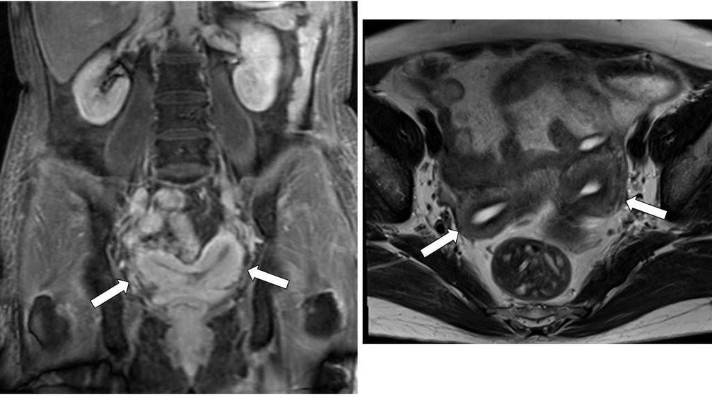 一位年輕女性磁振造影檢查呈現如圖,箭號所指之敘述何者最正確?