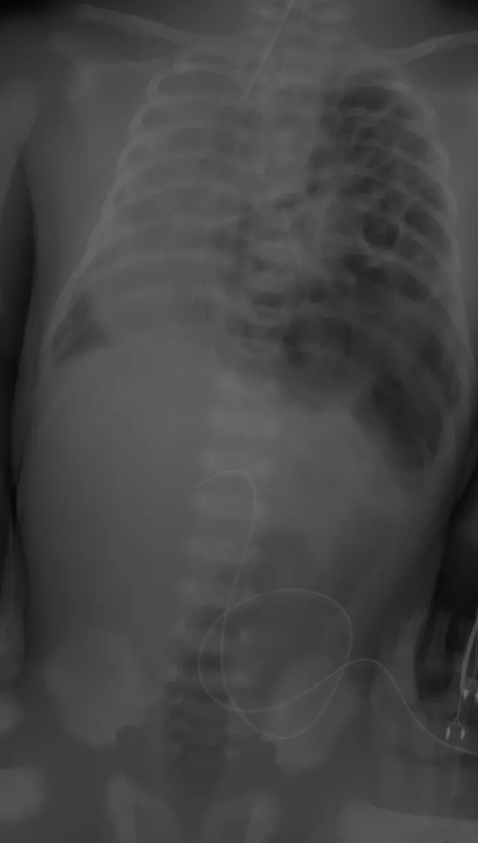【108-2 醫學(四) 第74題】足月產新生兒因呼吸急促住進新生兒加護病房,胸腹部X光如附圖,則最可能的診斷為下列何者?