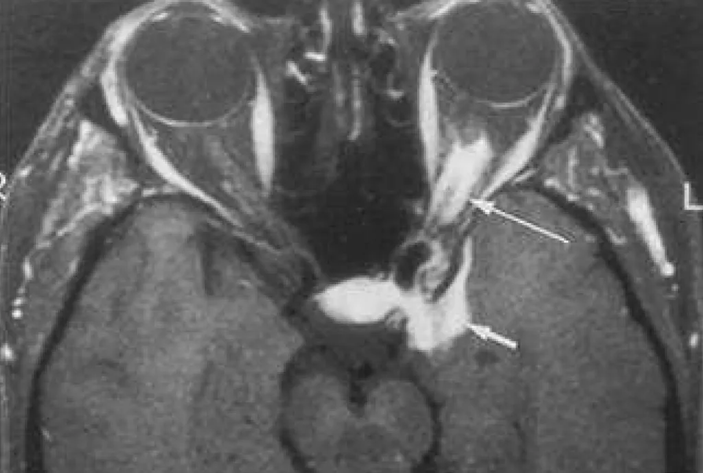 【108-2 醫學(六) 第72題】40歲女性患者,主訴幾個月來左眼視力逐漸減退,接受磁振造影檢查,圖為注射顯影劑後並且經過抑制脂肪處理的T1加權影像,圖中箭號所指最可能的病變是: