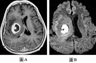 50歲男性患者,主訴左側肢體無力已經二個星期,接受磁振造影檢查,圖A是注射顯影劑後的T1加權影像,圖B是擴散加權影像(diffusion-weighted image),下列何者是最可能的診斷?