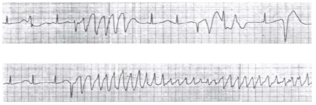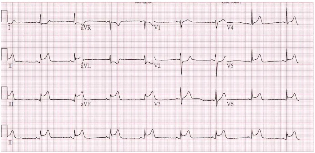 【109-1 醫學(三) 第62題】一位74歲男性有高血壓病史,因喘、下肢水腫住院,住院檢查發現左心室功能正常,也無心律不整,給予利尿劑與抗高血壓藥物治療,數日後卻出現反覆不省人事,無脈搏、無血壓,需電擊治療,心電圖監測紀錄如下所示,最可能合併何種電解質異常?