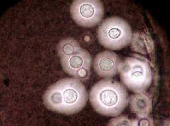 【109-1 醫學(三) 第61題】39歲男性過去身體健康良好,因一週來發燒和持續性的頭痛到院就醫。身體診察檢查發現體溫39.0℃,口腔上顎有白斑,頸部並沒有僵硬。血液檢查發現白血球數7020/μL。電腦斷層僅顯示腦部水腫。脊椎穿刺(lumbar puncture)發現壓力>600 mmH2O,生化檢查發現蛋白質94 mg/dL,顯微鏡檢如圖示。下列敘述何者最不適當?