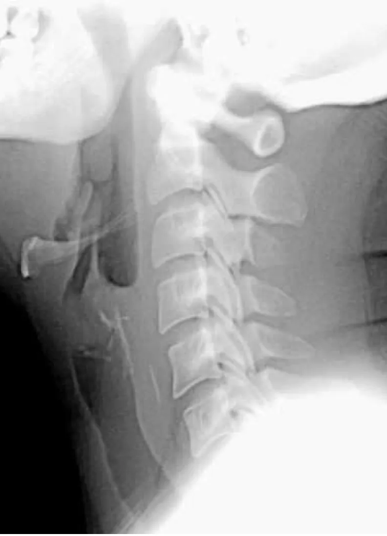 【109-1 醫學(六) 第25題】一中年男性晚飯後出現喉痛、吞嚥困難等症狀就診,頸部X光如下圖,下列敘述何者正確?