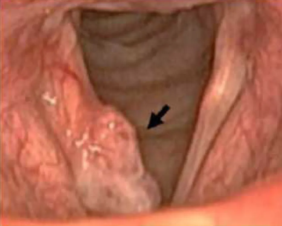 【109-1 醫學(六) 第24題】56歲男性,因聲音沙啞就診,經咽喉內視鏡檢查發現一腫塊如下圖所示,下列敘述何者正確?