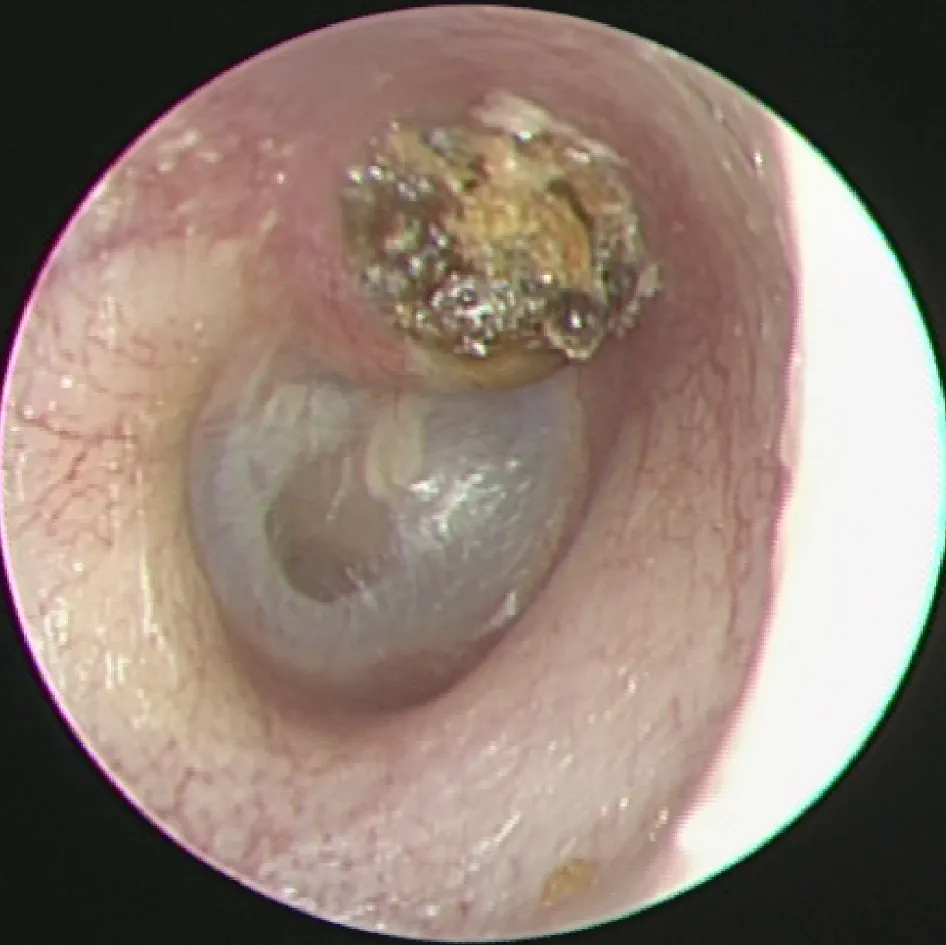 【109-1 醫學(六) 第20題】病人耳鏡檢查所見如下圖,最可能之診斷為: