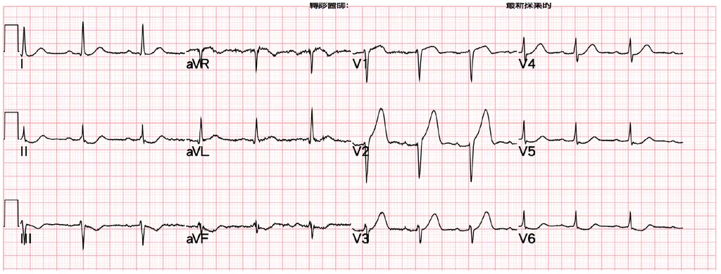 【110-1 醫學(三) 第13題】48歲男性,有高血壓及吸菸史,早上8點進辦公室便感到胸口悶痛、冒冷汗,被同事送至急診,9點做心電圖顯示如下圖,你是急診醫師,下列判斷及處置何者正確?