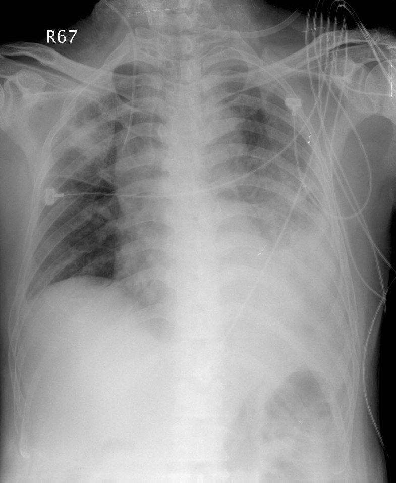 77歲病患有糖尿病和高血壓10年,持續接受藥物(metformin、amlodipine、aspirin)穩定控制外,身體健康,並維持規律運動。家人描述病患在最近結束郵輪旅遊4天後,出現漸進性發燒、寒顫、乾咳和腹瀉,來院前意識不清。病人就醫時,檢查發現病患對於環境、時間、和人定位感喪失,體溫39.5℃,血壓96/58 mmHg,脈搏每分鐘128下,呼吸急促,每分鐘36次。肺部聽診左右雙側都有囉音(rales)。血液相發現白血球 17400/mm³,血鈉125 mmol/L。其餘生化檢查正常。血氧飽和度在使用面罩給予每分鐘10L氧氣(濃度60%)下,血氧飽和度是89%。痰液革蘭氏染色(Gram's stain)低倍顯微鏡檢僅發現50~60顆白血球,無可見微生物。緊急胸部X光如圖。此病患最有可能的診斷為何?