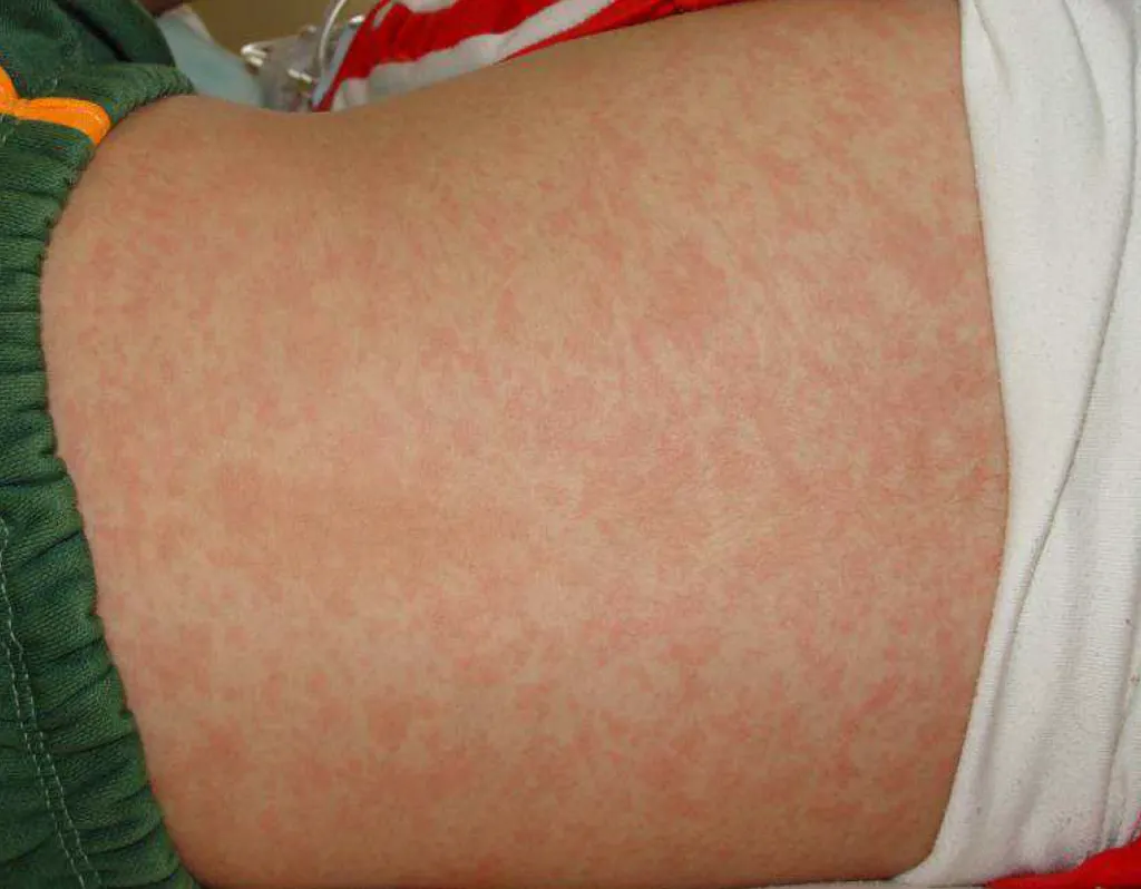 【110-2 醫學(四) 第2題】10 個月大男童 15 天前從國外返台,6 天前開始出現發燒、咳嗽、流鼻水和結膜炎,身體診察發現臉上和身上有皮疹如圖所示,下列何者是最有可能的診斷?