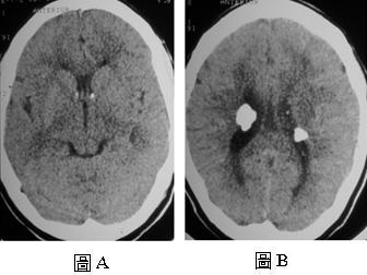 32 歲女性患者有癲癇、心智遲緩的病史, ,接受電腦斷層檢查,2 張圖分別是未注射顯影劑的不同切面影像,下張圖分別是未注射顯影劑的不同切面影像列何者是最可能的診斷?
