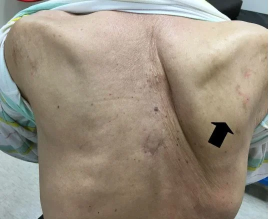 【110-2 醫學(六) 第58題】當這個病人雙手推牆時,發現他右側肩胛骨鼓起並往外移動,他最有可能是那一條神經病變?