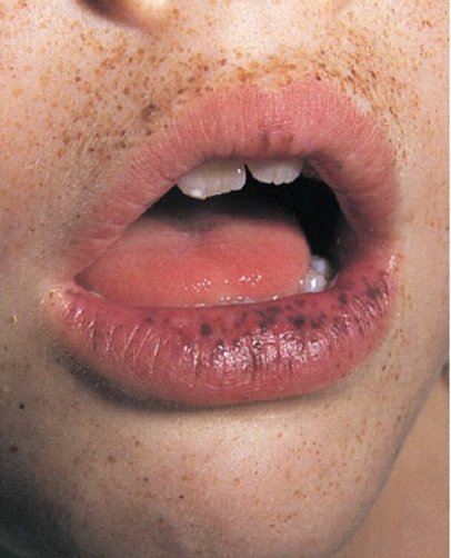 14歲女生血便,身體診察發現嘴唇有黑色斑點如圖所示。下列敘述何者正確?