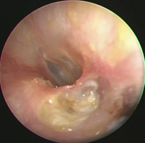 【111-1 醫學(六) 第19題】病人左耳耳鏡檢查所見如下圖,最可能之診斷為: