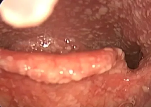 【111-1 醫學(六) 第24題】66歲女性糖尿病病人,近幾個月來使用吸入式類固醇(inhaled corticosteroid)控制氣喘,因喉嚨疼痛、吞嚥不適而前來就診,經內視鏡檢查咽喉部如下圖,最可能之診斷為何?