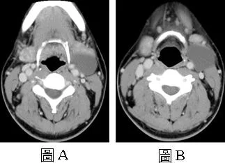 【111-1 醫學(六) 第72題】41歲男性患者,主訴左頸部摸到腫塊,接受電腦斷層檢查,2張圖分別是注射顯影劑的不同切面影像,下列何者是最可能的診斷?