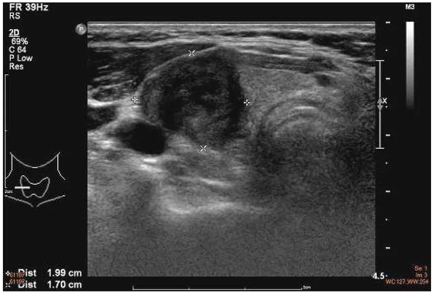 【111-2 醫學(五) 第41題】一位 65 歲男性發現右頸部有一硬塊,頸部超音波檢查如附圖,細針穿刺細胞學檢查顯示為甲狀腺乳突癌 (papillary thyroid cancer),根據超音波圖像,此甲狀腺癌可能合併下列何者特性?