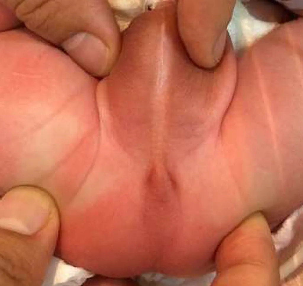 一男嬰出生後發現為無肛症(anorectal malformation),旋即被送至加護病房,兒童外科醫師立即被照會至現場診視,所見會陰部如圖所示,下列敘述何者正確? 1)本病患為高位無肛症,可能合併泌尿生殖道異常 2)若腹脹或嘔吐應置放胃管 3)應檢查脊柱是否異常 4)應立即安排手術做腸造口
