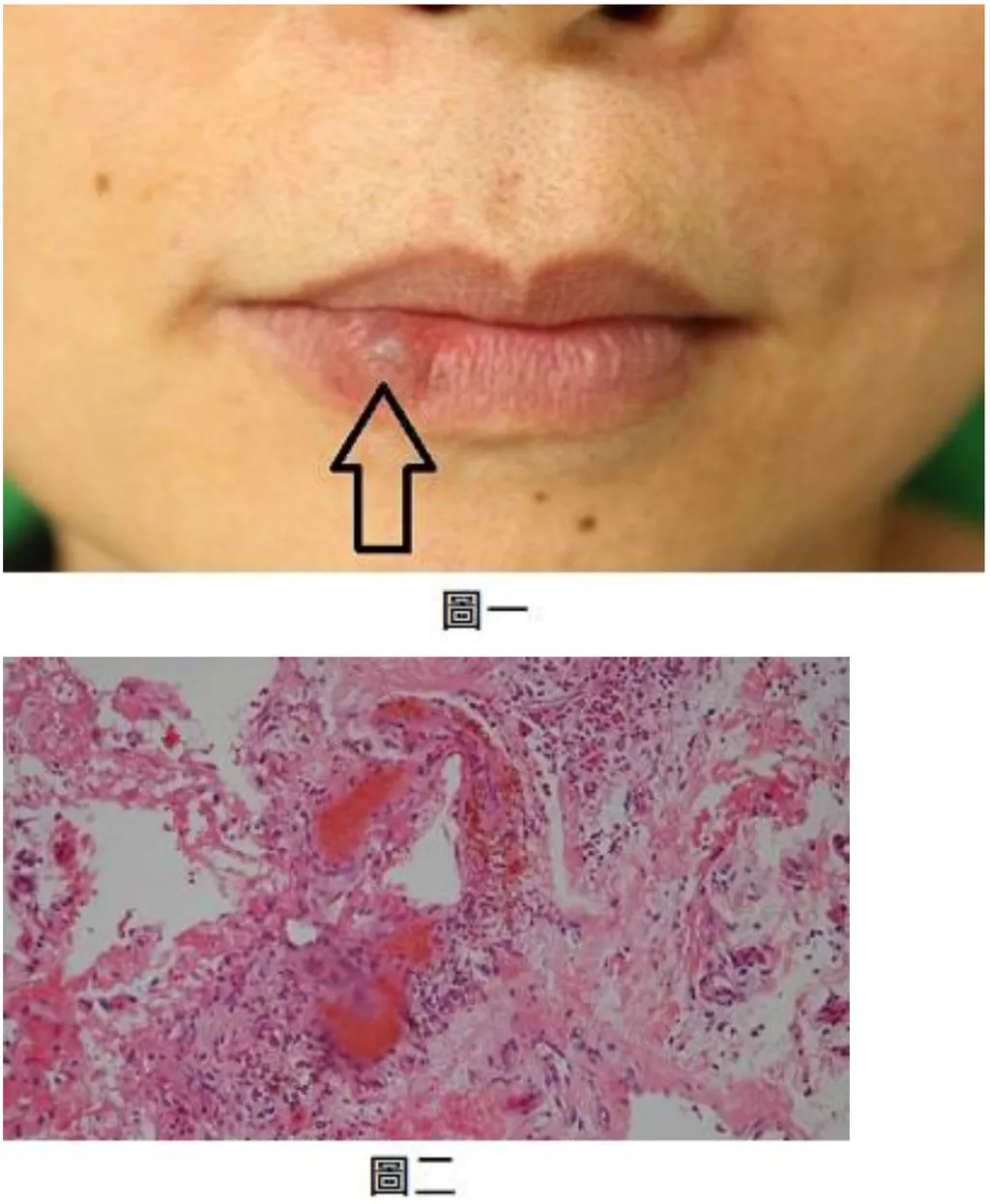 【111-2 醫學(四) 第38題】60 歲的女性,病患自述約一週前在下唇出現一個直徑約 1 公分、無痛、暗紫色、有彈性的丘疹(如圖一所示),並否認有外傷的情況。經切片手術之病理檢查如附圖二。下列何者為最可能的診斷?