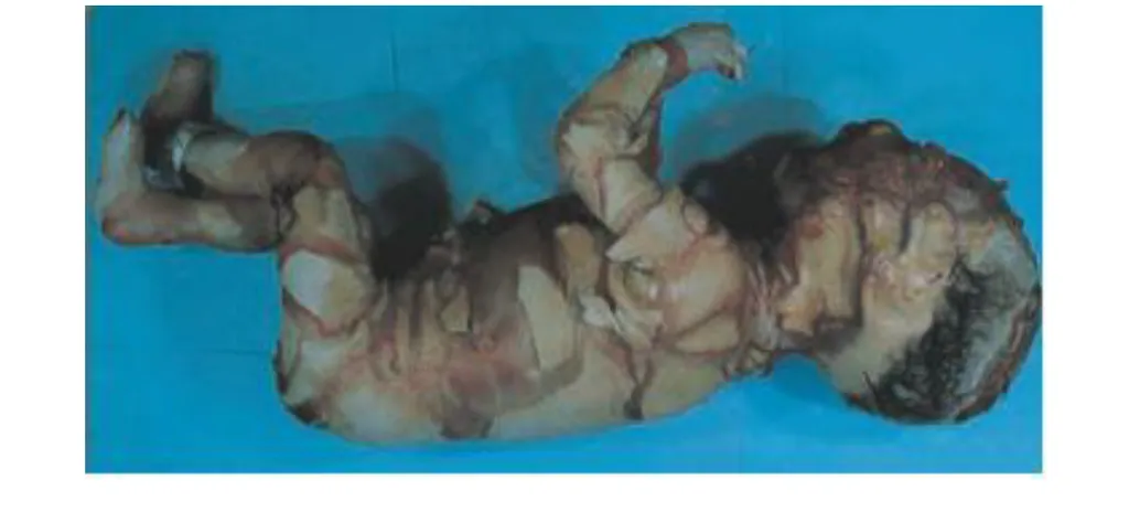 【111-2 醫學(四) 第43題】出生後便立即去世之胎兒,全身被極厚的膜狀物包覆(如圖所示),此病患最可能之診斷為何?