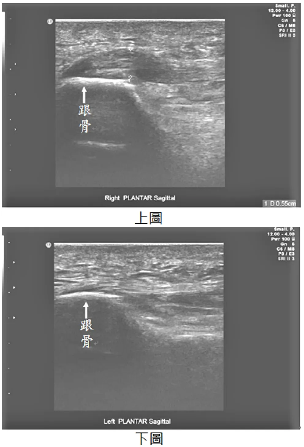 【112-2 醫學(六) 第74題】63歲女性病人,主訴右足底疼痛,於起床著地時特別明顯。超音波檢查如圖,上圖為右側足底筋膜連結至跟骨處,下圖為左側足底筋膜連結至跟骨處,最可能診斷為何?