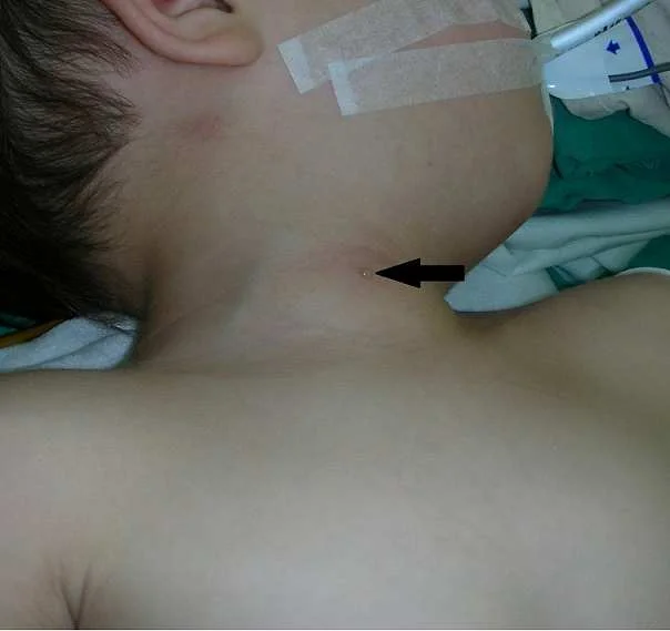 一位 6 個月大的幼兒過去無任何病史,因頸部胸鎖乳突肌前緣皮膚有一小開口且有分泌物(如圖所示)接受手術,最可能的診斷為何?