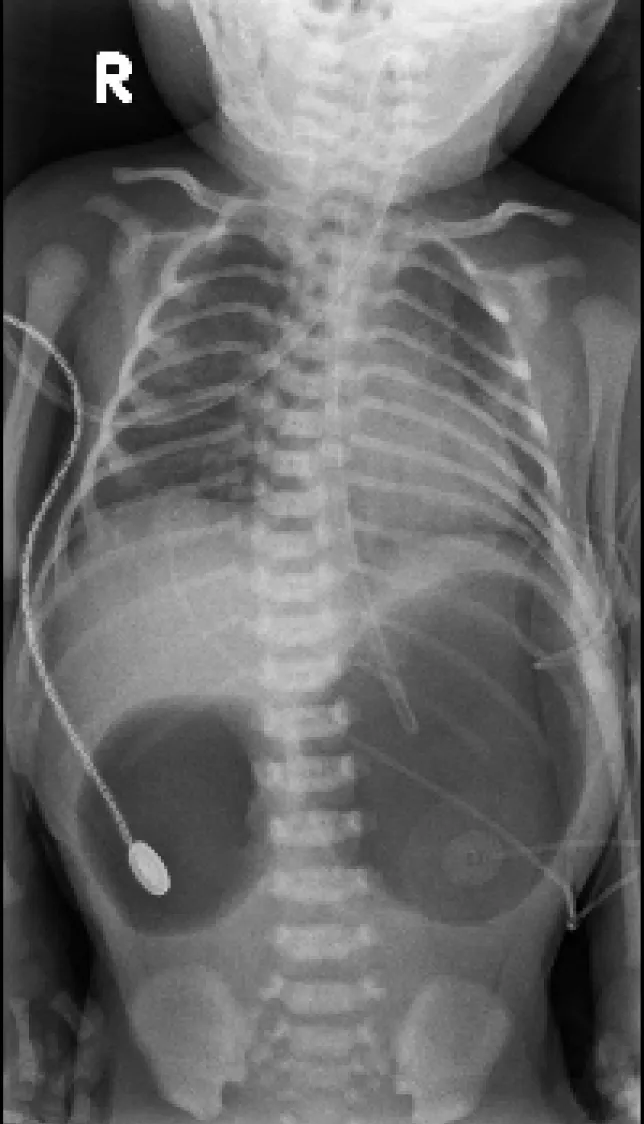 【113-1 醫學(五) 第48題】承上題,檢查全身無明顯出血及外傷,頭部電腦斷層無頭骨骨折及顱內出血,但仍意識不清,胸腹部X 光如圖所示,輸注packed RBC 100 mL 後量測生命徵象,血壓114/53 mmHg,心跳163/min,呼吸28/min,體溫 36.7℃,脈搏血氧飽和度90%,下列敘述何者錯誤?
