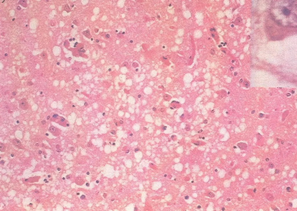 【113-1 醫學(二) 第99題】圖中所示是一個具有高度傳染性的腦組織鏡下所見,罹患該病的患者容易有下列何種情形?