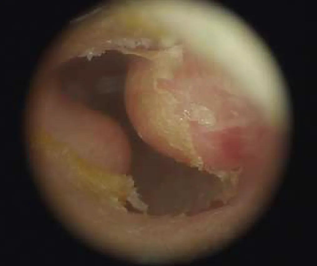 【113-1 醫學(六) 第20題】一中年男性長年四季晨泳,耳鏡檢查發現如圖,下列何者為最可能之診斷?