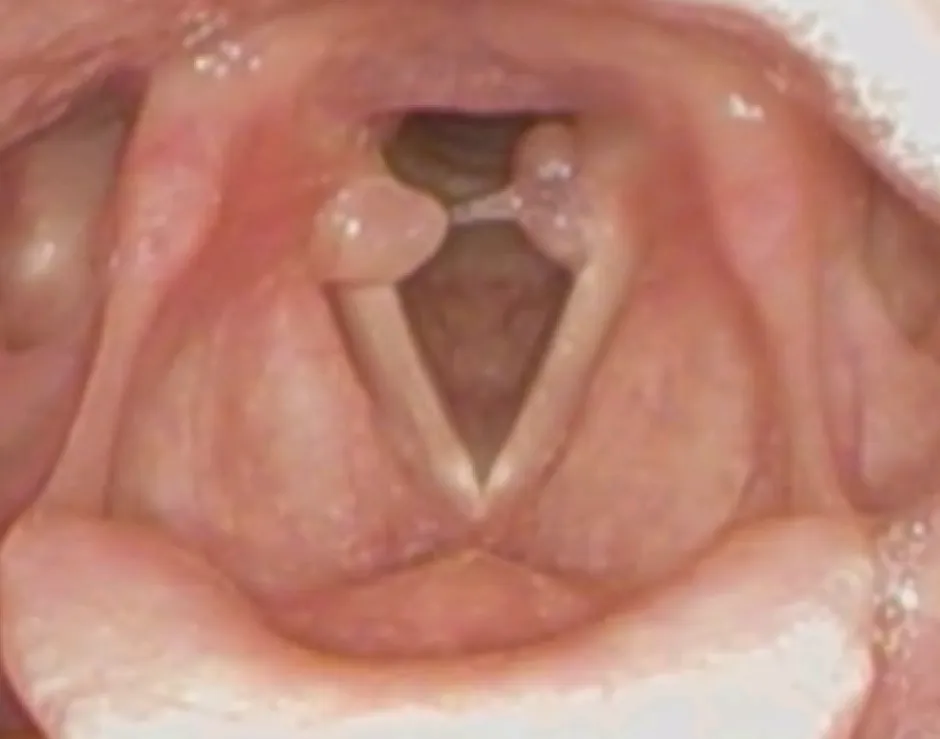 【113-2 醫學(六) 第25題】32歲女性,無抽菸喝酒病史,主訴1個月前曾接受全身麻醉手術,之後出現咽喉疼痛、異物感、發聲不適等症狀。就診檢查時咽喉內視鏡之影像顯示如下圖,下列敘述何者正確?