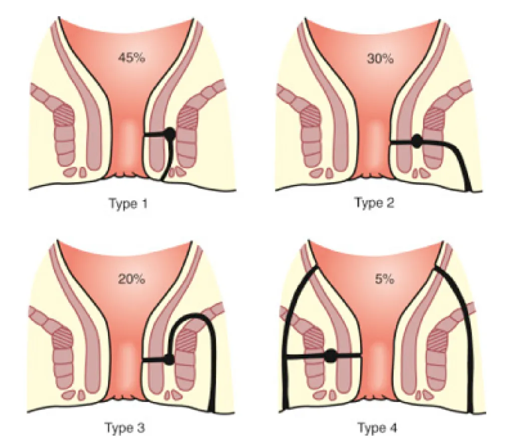 【114-1 醫學(五) 第51題】附圖中何者屬於transsphincteric type瘻管?