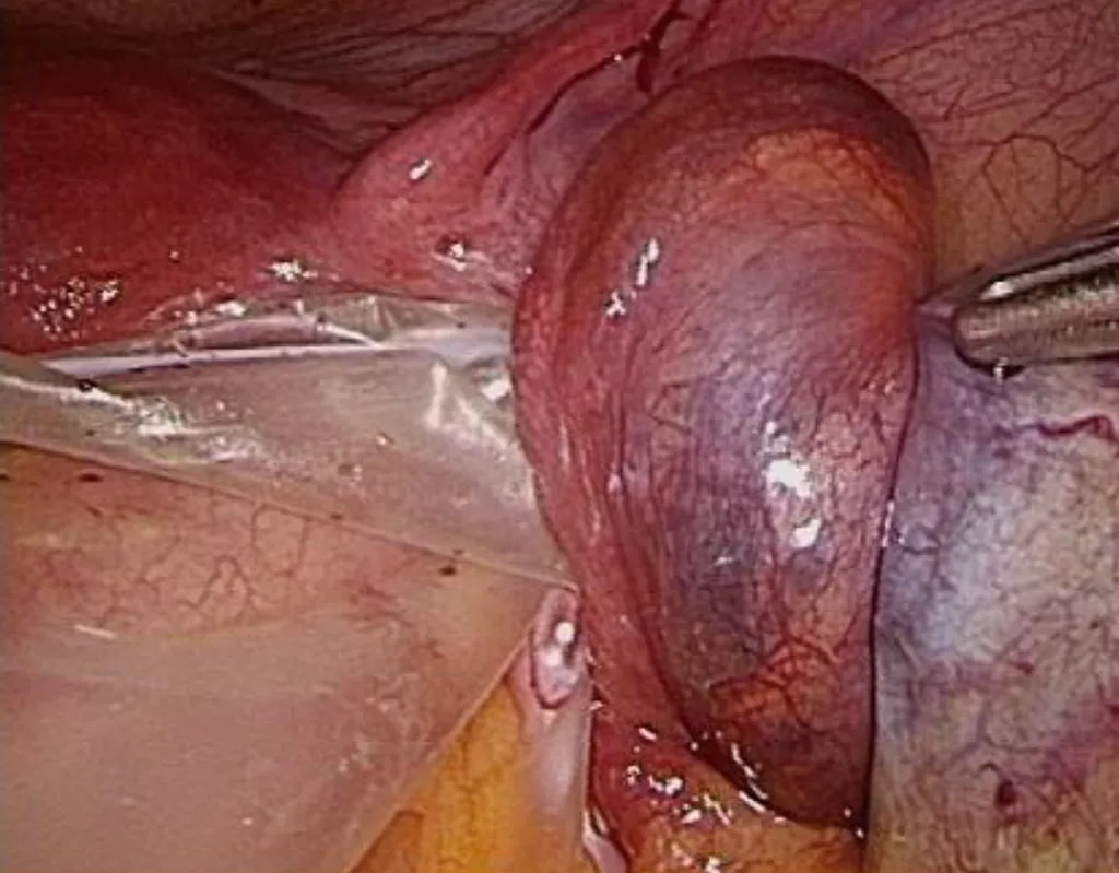 【114-1 醫學(六) 第40題】27 歲女性,G1P0A1,昨日開始劇烈右下腹痛,合併些微噁心嘔吐症狀,無陰道出血、發燒、腹瀉症狀,驗孕結果為陰性,腹腔鏡手術發現如下圖,下列何者為最可能診斷?
