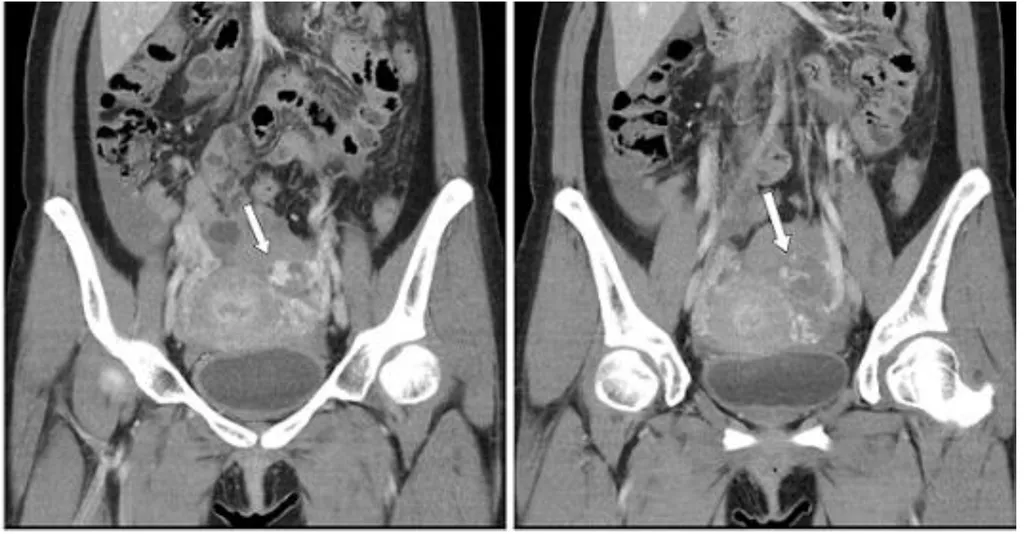 【114-1 醫學(六) 第73題】28 歲女性主訴腹部突然劇痛,注射顯影劑後電腦斷層檢查呈現如圖,箭號所指之病灶,下列何項診斷最不可能?