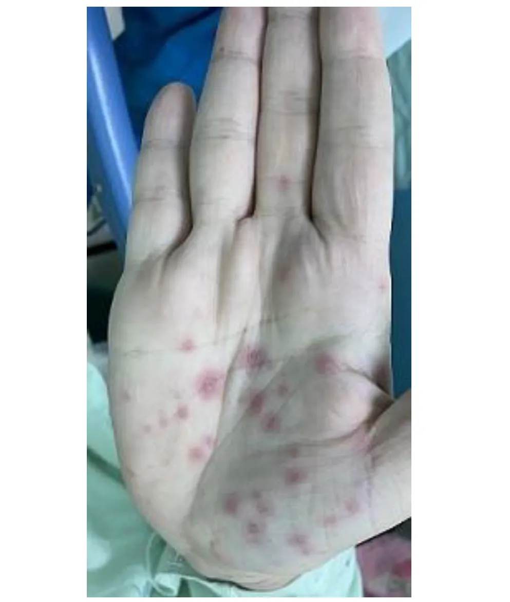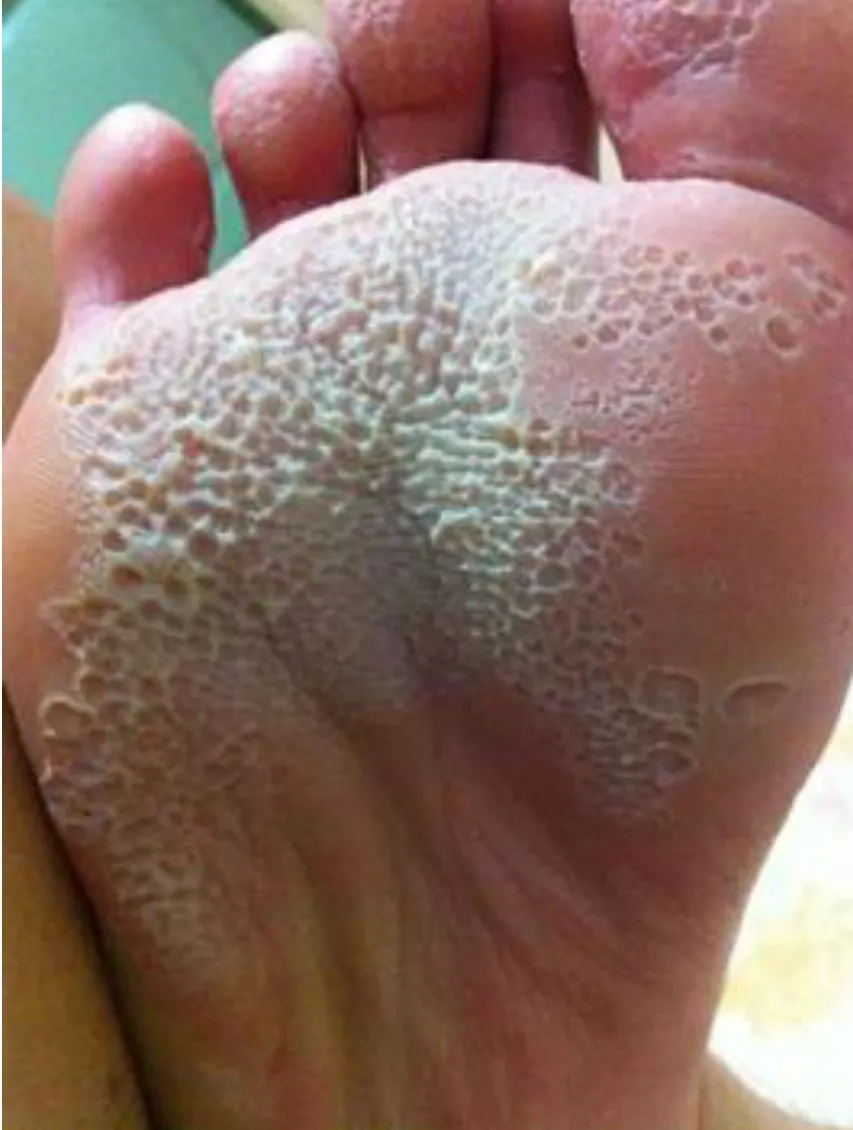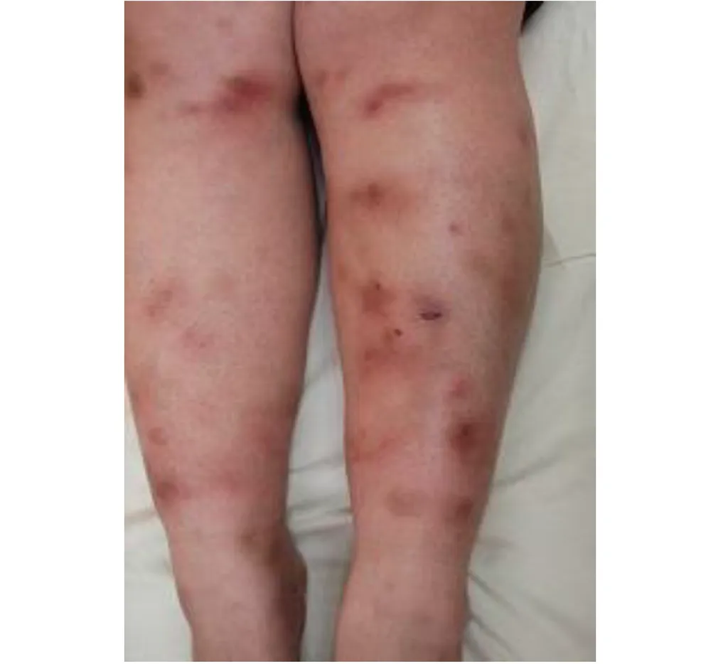 55 歲男性,自兩年前在軀幹與四肢陸續出現許多無症狀的紅色斑塊,並合併輕微脫屑(如圖所示),經KOH 檢查並未發現有黴菌感染;最近數週發現有些病灶形成結節。皮膚切片之病理檢查結果顯示表皮中有許多異常細胞浸潤(如附圖所示)。此患者最可能的診斷為下列何者?