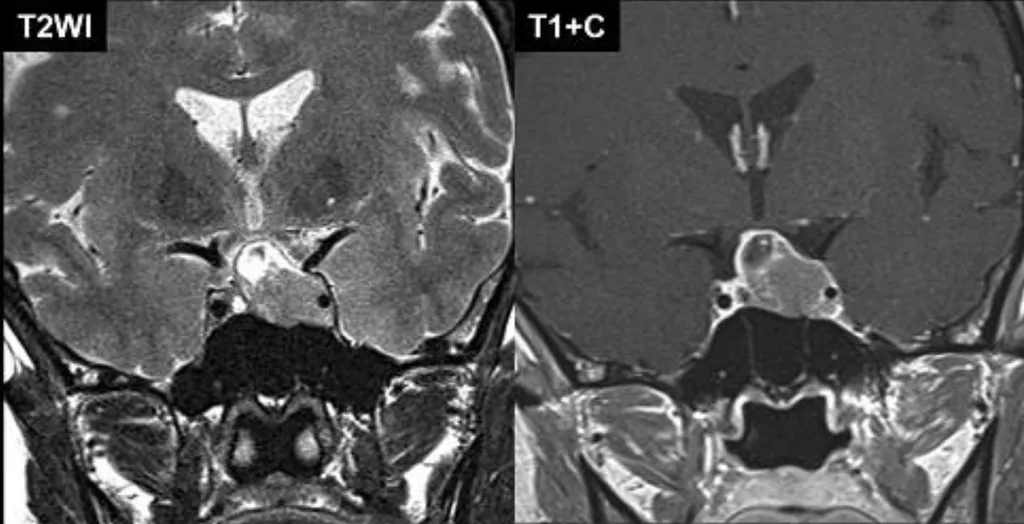 【114-1 醫學(四) 第74題】53 歲女性,一個月來有頭痛現象,根據所附二張 MRI 影像,下列何者為最可能的診斷?