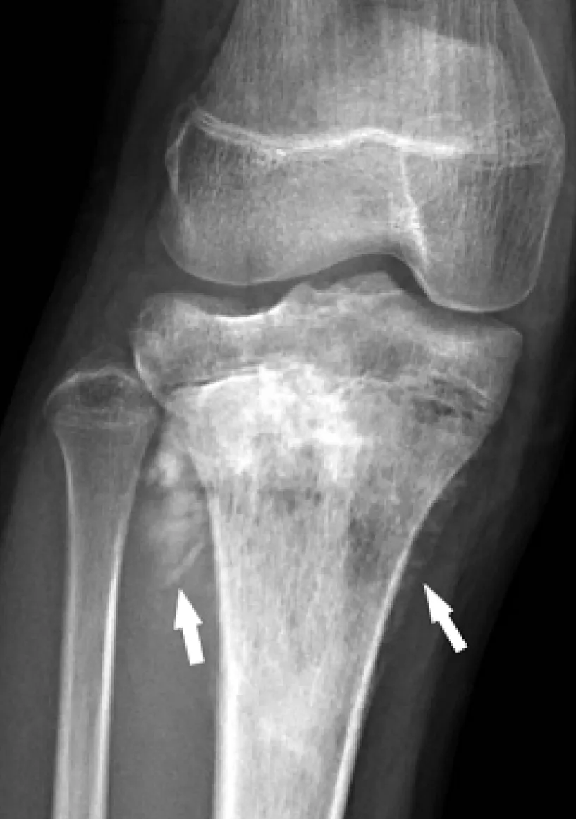 【114-1 醫學(五) 第73題】附圖是一位13歲女性脛骨骨肉瘤(osteosarcoma)的膝部X光影像,箭頭所指的影像表現是下列何者?