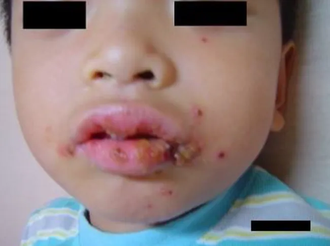 【114-2 醫學(四) 第26題】2 歲男童發燒 5 天,嘴唇及臉部出現許多紅疹及結痂(如圖示),經檢查發現牙齦處也有紅腫流血,身體其他部位則無疹子。最可能的致病原為何?