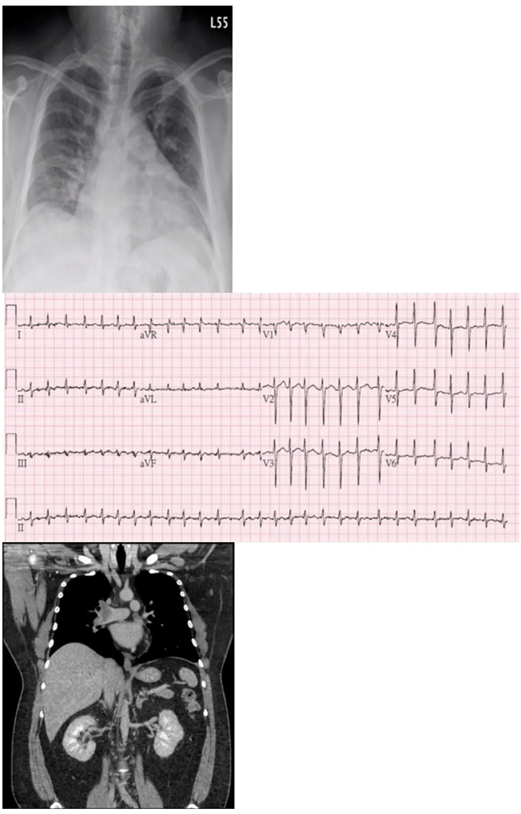 【115-1 醫學(三) 第9題】40 歲男性有 10 年心悸病史未妥善就醫,近一星期症狀加重,呼吸困難。到院時,BMI=41 kg/m , BP 126/72 mmHg,HR 141/min,RR 28/min,Temp 36.90 ℃,SpO2 97%,無貧血,甲狀腺觸診未有異常,未有第三心音及心雜音,肝脾不大,無腹水,雙下肢微腫。相關檢查如附圖。抽血報告如下:NT Pro-BNP 2470 pg/mL, Troponin T 0.019 ng/mL,D-dimer 20 mg/L FEU,ALT 196 U/L。下列何項診斷最符合目前狀況?